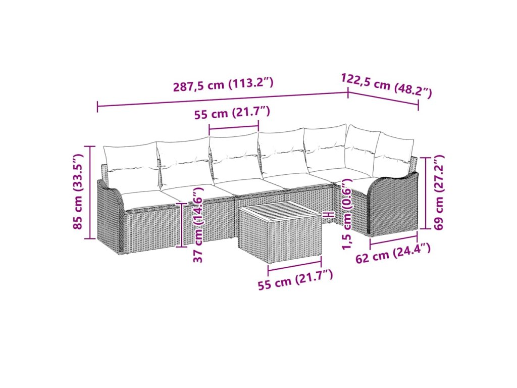 - Součásti soupravy: Sada zahrnuje tři středové sedačky, jedno rohové sedadlo, dvě křesla a multifunkční zahradní stolek. Každé sedadlo má lehké, ale odolné polštáře z polyesterového vlákna s uzávěrem na zip pro snadnou údržbu. Rám z práškově lakované oceli přidává stabilitu a oporu, čímž zvyšuje celkovou odolnost soupravy.