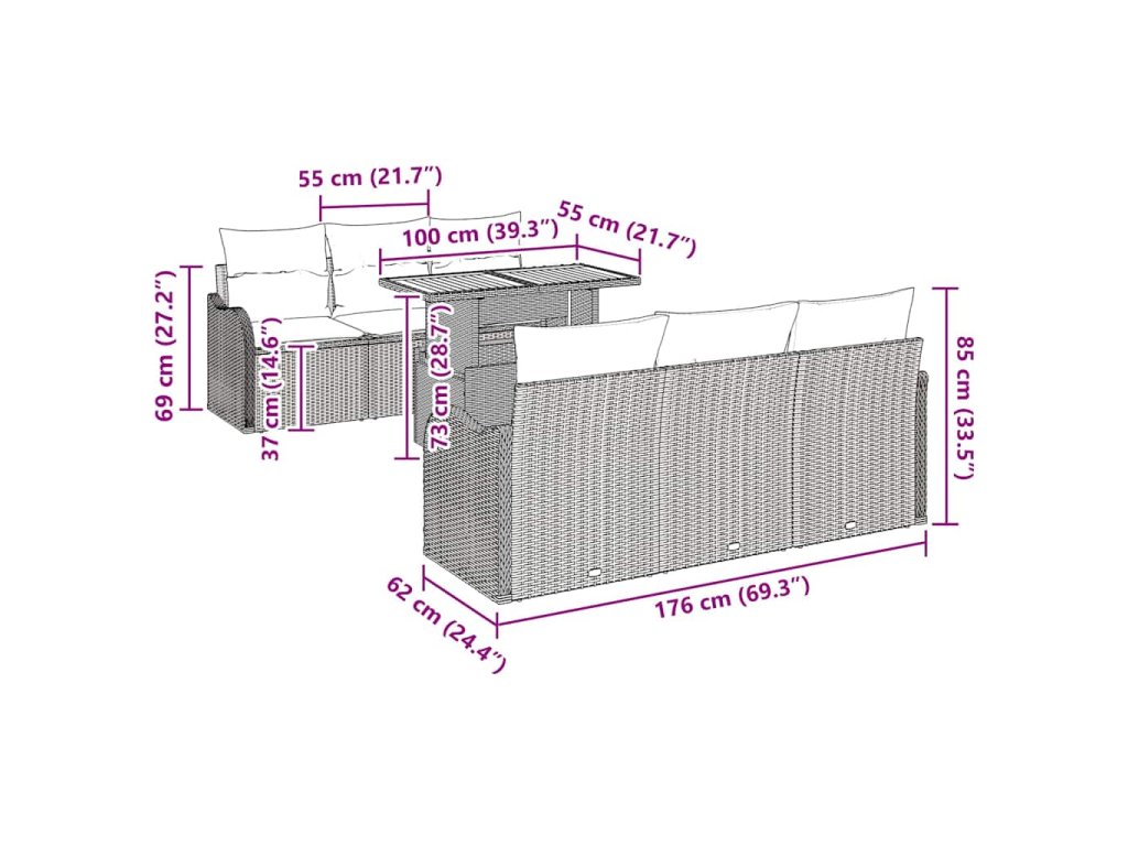 - Součásti: Set se skládá ze čtyř opěrákových pohovek, dvou středových sedadel a jednoho univerzálního zahradního stolu. Každá pohovka má zakřivenou opěrku a stylový design zaměřený na komfort. Odnímatelné polštáře na opěradlech a sedadlech jsou lehce čistitelné, což usnadňuje údržbu a prodlužuje jejich životnost.