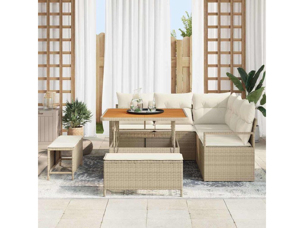 - Vysoce kvalitní materiály: Tato sedací souprava z poly ratanu nabízí stylový a odolný povrch, který vydrží venkovní počasí. Rámy z práškově lakované oceli jsou pevné a akáciové dřevo dodává celému designu elegantní nádech.