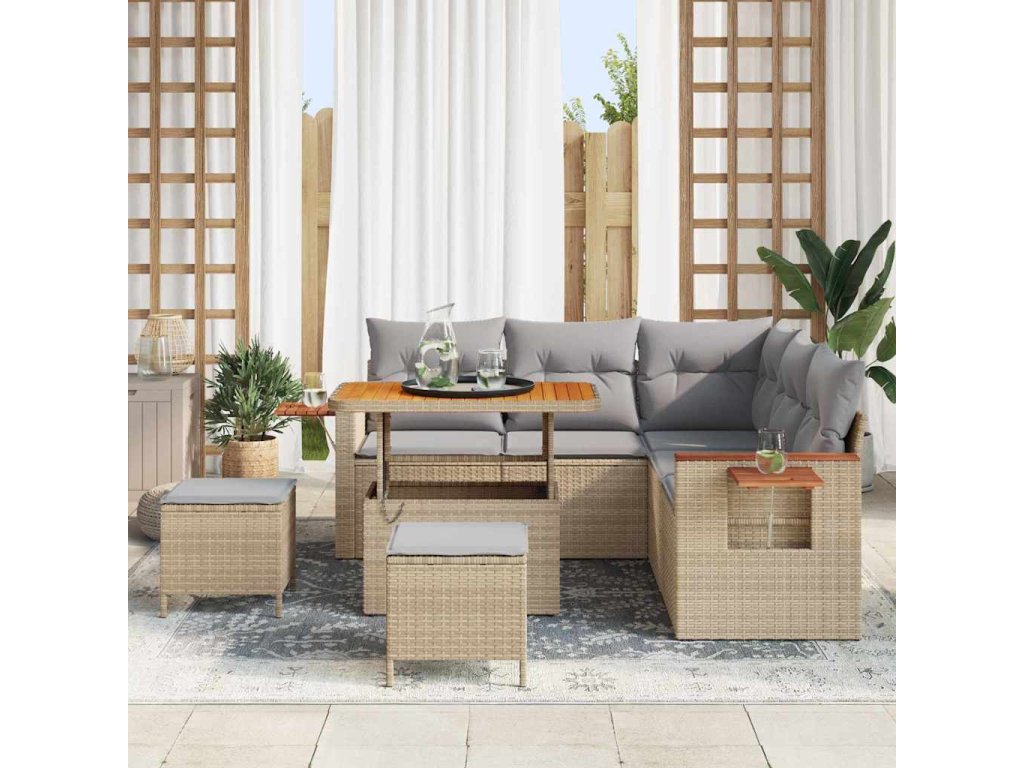 - Komplexní komponenty Tato sada zahrnuje pohodlný venkovní polštář, přímo určený na počasí. Rám z práškově lakované oceli poskytuje pevnou oporu, ale zároveň lehkou konstrukci. Polyratanové opěrky a akáciový dřevěný povrch přidávají funkční eleganci, a to zvyšuje pohodlí a použitelnost celého setu.