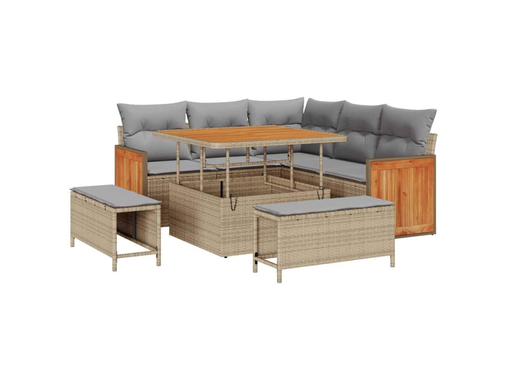 - Součásti: Tato souprava má stylový stůl s možností výškového nastavení, díky čemuž se dá proměnit z konferenčního stolku na jídelní stůl, což je praktické pro rozmanité potřeby. Dále obsahuje pohodlné sedáky s polštáři, které mají zip, takže je lehké je odstranit a vyčistit.