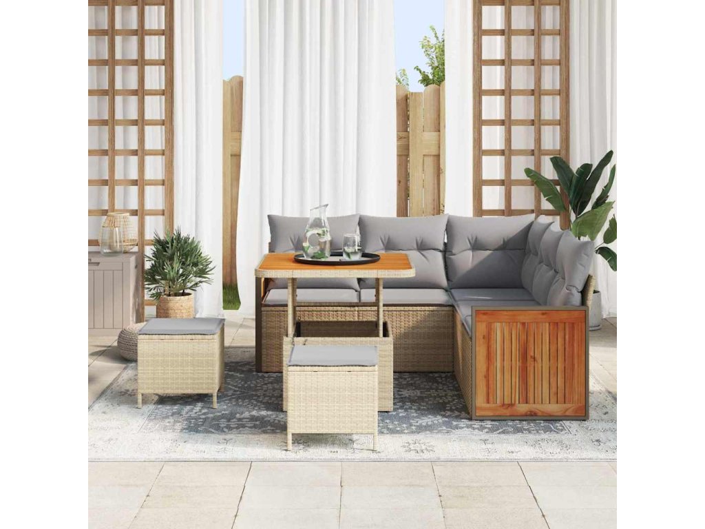 - Součásti: Tato souprava má stylový stůl s možností výškového nastavení, díky čemuž se dá proměnit z konferenčního stolku na jídelní stůl, což je praktické pro rozmanité potřeby. Dále obsahuje pohodlné sedáky s polštáři, které mají zip, takže je lehké je odstranit a vyčistit.
