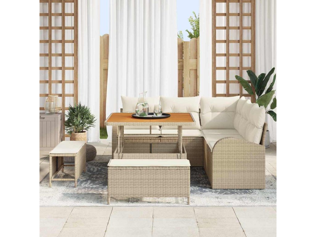 - Funkční komponenty: Pevná akáciová deska a poly ratanové opěrky zajišťují pohodlí a praktičnost. Polštáře mají pohodlný zip pro jednoduché čištění. Ocelové nohy nabízejí stabilní podporu a zpevňují strukturu každého kusu.