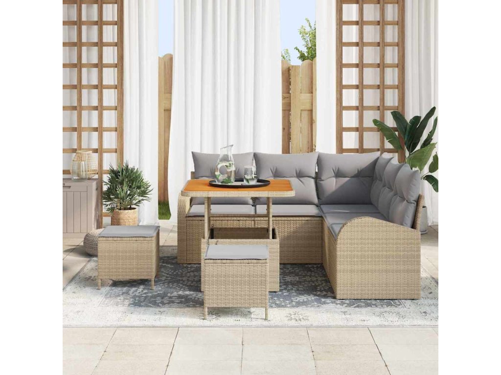 - Funkční komponenty: Pevná akáciová deska a poly ratanové opěrky zajišťují pohodlí a praktičnost. Polštáře mají pohodlný zip pro jednoduché čištění. Ocelové nohy nabízejí stabilní podporu a zpevňují strukturu každého kusu.
