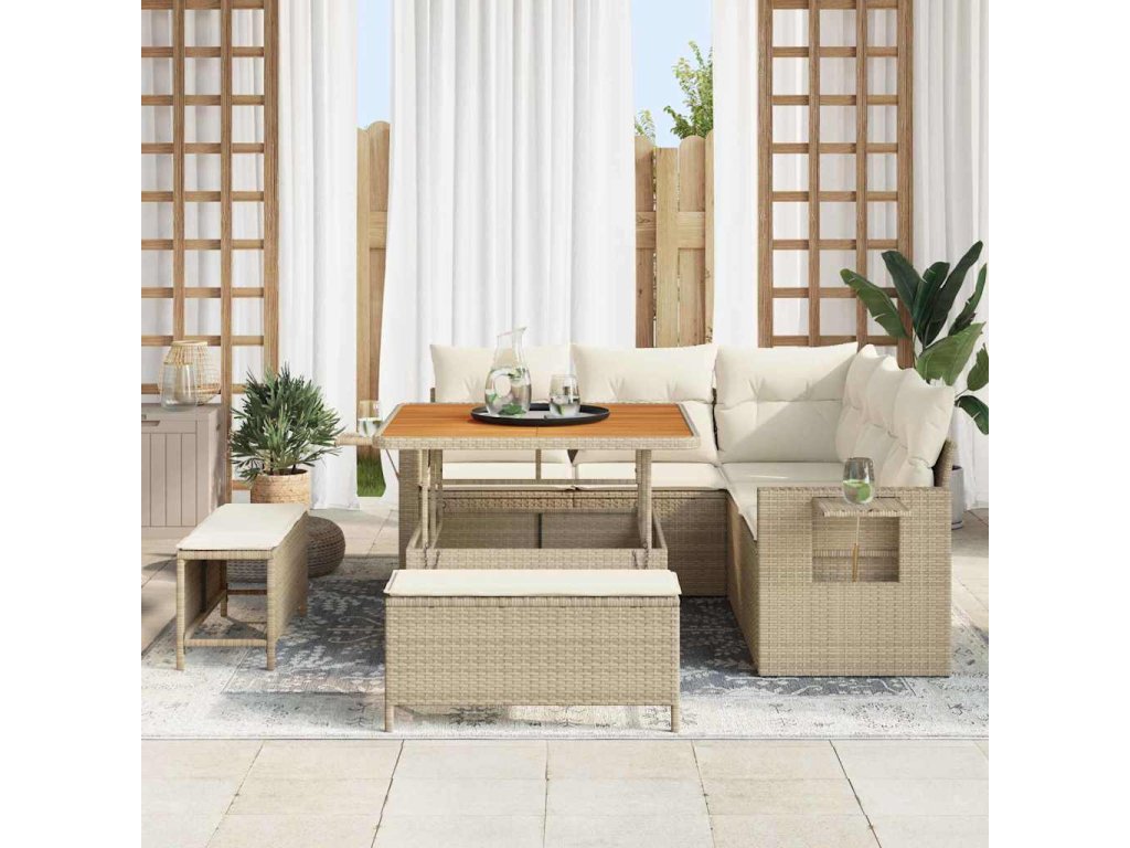 - Prémiové materiály: Sada modulárního zahradního gauče je z kvalitního polyratanu, známého svou odolností a schopností vydržet venkovní podmínky, což zajišťuje dlouhý životnost. Doplňuje ji masivní akáciové dřevo, které činí sadu přitažlivou a elegantní.