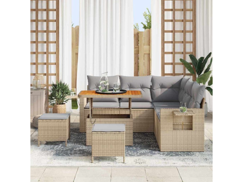 - Prémiové materiály: Sada modulárního zahradního gauče je z kvalitního polyratanu, známého svou odolností a schopností vydržet venkovní podmínky, což zajišťuje dlouhý životnost. Doplňuje ji masivní akáciové dřevo, které činí sadu přitažlivou a elegantní.