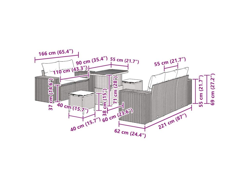 - Zahrnuté komponenty: Každý díl tohoto setu má poly ratanové opěrky a ergonomická opěradla pro maximální pohodlí. Pevné ocelové nohy dodají stabilitu a modulární design umožňuje snadné přizpůsobení. Polštáře z polyesterových vláken zajišťují komfort a odolnost během používání.