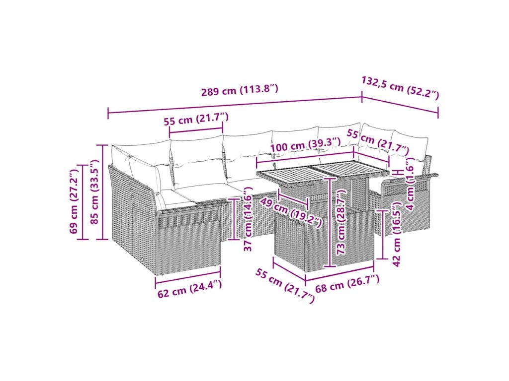 - Pokyny pro údržbu: Aby byla zajištěna bezvadná podmínka sady zahradního nábytku, doporučuje se používat kryty, když se nepoužívá, a otírat povrchy vlhkým hadříkem pro snadné čištění. Pro maximální dlouhověkost se doporučuje uchovávat polštáře na suchém místě, když se nepoužívají, což zajišťuje, že zůstanou tak pohodlné a příjemné, jak při příjezdu.