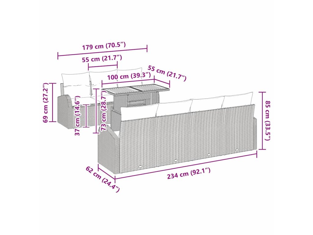- Součásti: Set obsahuje čtyři pohovky na rukou, tři středové sedačky (všechny s vestavěným úložným prostorem) a zahradní stůl, takže máte pokryté všechny potřeby venkovního sezení. Každý kus je pečlivě vyrobený pro praktické používání, a úložný prostor je super užitečný pro venkovní život.