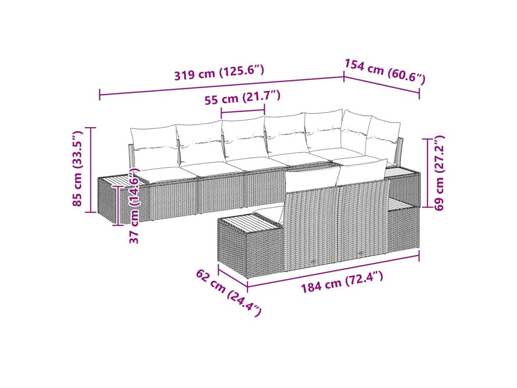 - 4 x Boční pohovka: 184 x 62 x 69 cm (D x Š x V)