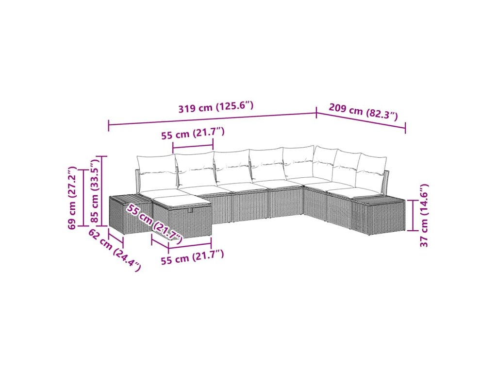- 2 x boční pohovka: 184 x 62 x 85 cm (D x Š x V)