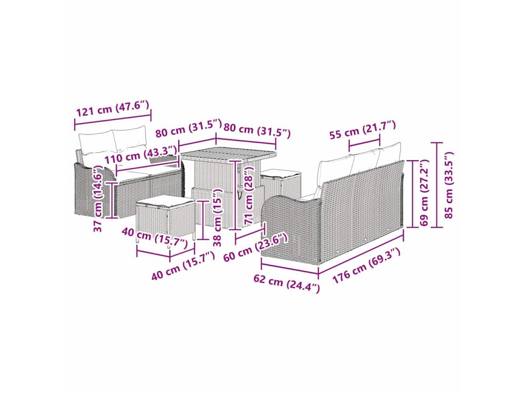 - 4 x Pohovka s opěrkami: 60.5 x 62 x 85 cm (ŠxHxV)