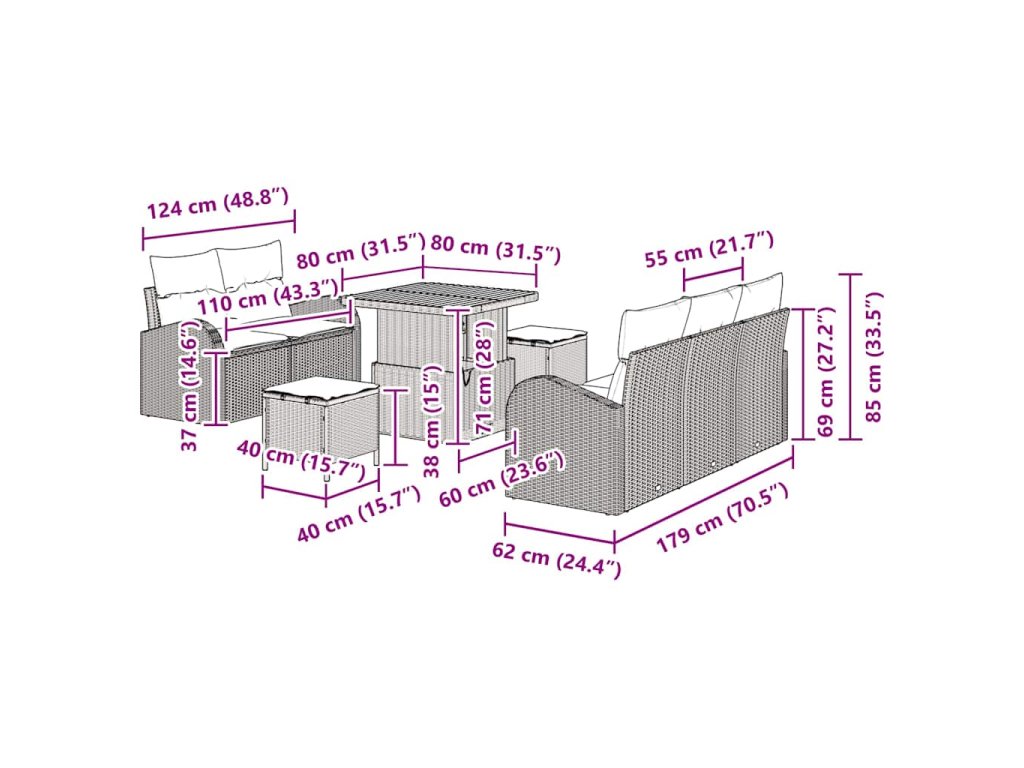 Tento moderní venkovní pohovkový set je skvělý pro každý venkovní prostor. Nabízí ideální mix stylu a funkčnosti, s čistými liniemi a minimalistickým designem, který udělá tvoji zahradu nebo terasu krásnější. Je to prostor pro odpočinek i setkání, a díky odolnému materiálu si ho užiješ venku, ať už s přáteli nebo sám.
