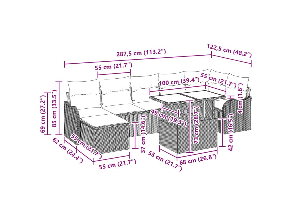 - Funkční komponenty: S práškově lakovaným ocelovým rámem a poly ratanovými opěrkami, tohle všechno zajišťuje pohodlnost a odolnost. Obsahuje skleněnou tabuli, odnímatelné polyesterové polštáře a tenké podušky pro pohodlné sezení.