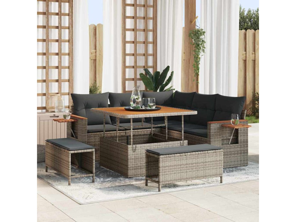 - Komplexní komponenty Tato sada zahrnuje pohodlný venkovní polštář, přímo určený na počasí. Rám z práškově lakované oceli poskytuje pevnou oporu, ale zároveň lehkou konstrukci. Polyratanové opěrky a akáciový dřevěný povrch přidávají funkční eleganci, a to zvyšuje pohodlí a použitelnost celého setu.