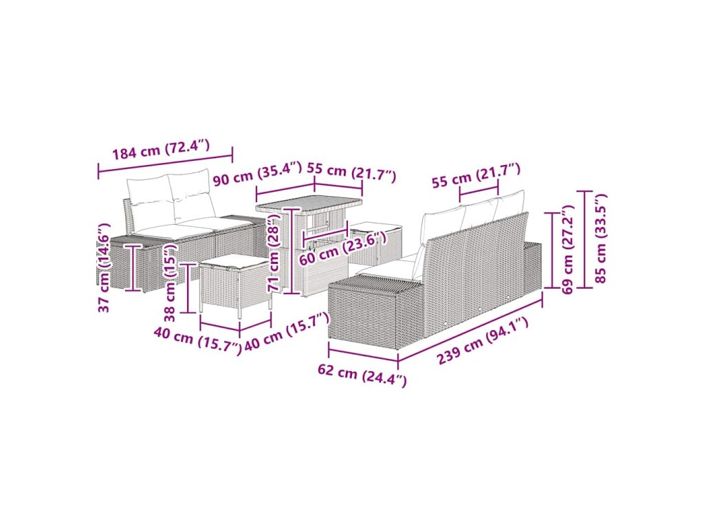 - 4 x Boční sofa: 92 x 62 x 69 cm (D x Š x V)