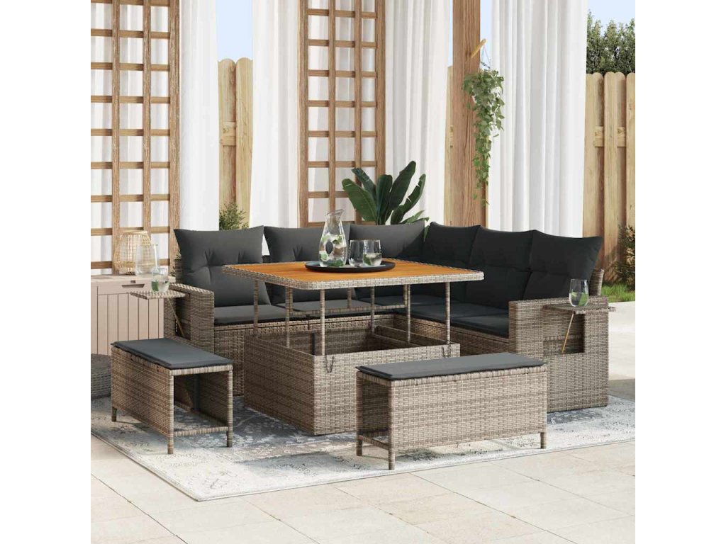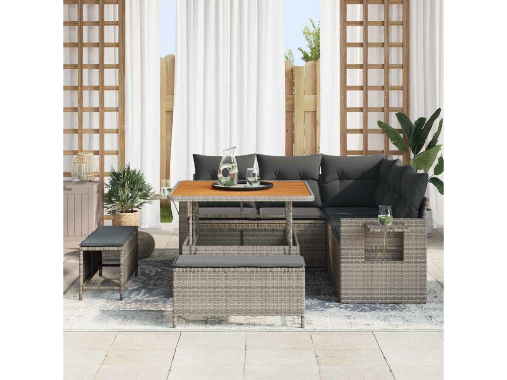 - Prémiové materiály: Sada modulárního zahradního gauče je z kvalitního polyratanu, známého svou odolností a schopností vydržet venkovní podmínky, což zajišťuje dlouhý životnost. Doplňuje ji masivní akáciové dřevo, které činí sadu přitažlivou a elegantní.