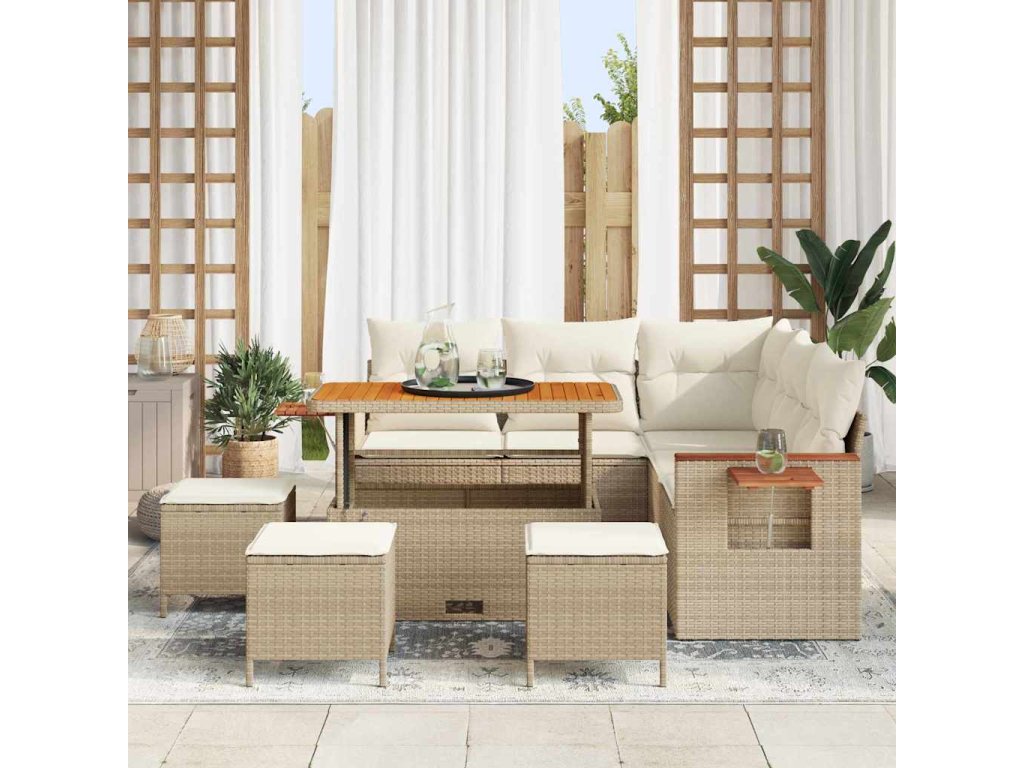 - Komplexní komponenty Tato sada zahrnuje pohodlný venkovní polštář, přímo určený na počasí. Rám z práškově lakované oceli poskytuje pevnou oporu, ale zároveň lehkou konstrukci. Polyratanové opěrky a akáciový dřevěný povrch přidávají funkční eleganci, a to zvyšuje pohodlí a použitelnost celého setu.