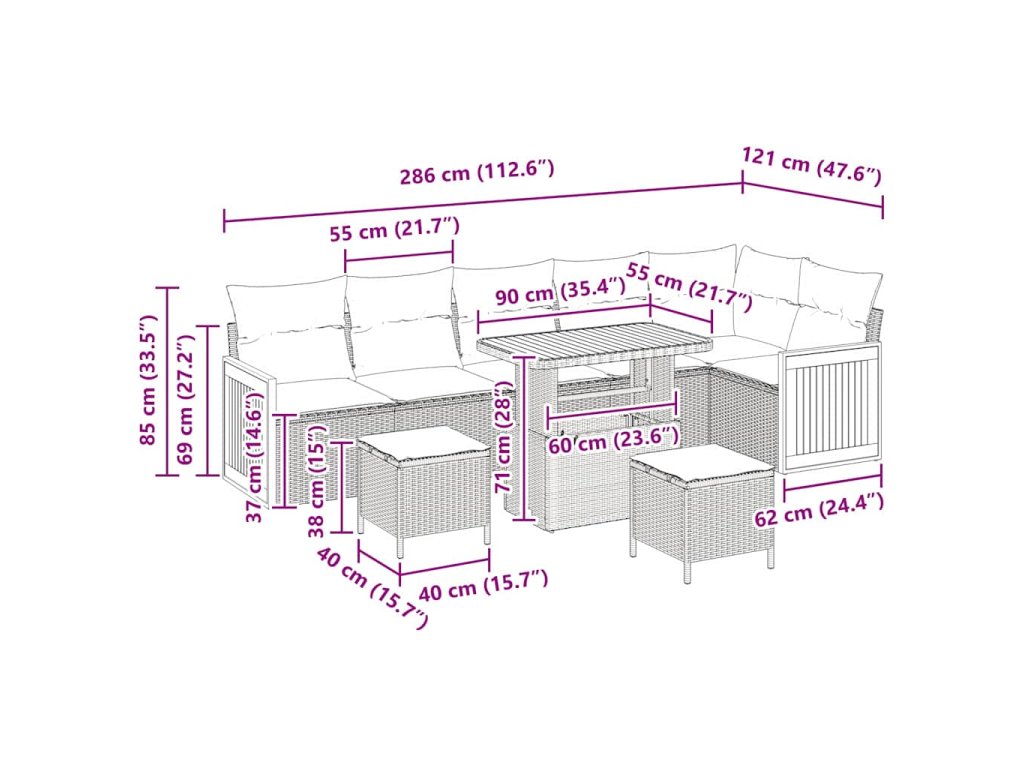 - Komfortní prvky: Pohovka je vybavená odnímatelnými polštáři se zipem, které zvyšují pohodlí. Měkký polyester poskytuje příjemné sezení, zatímco polyratanová opěradla nabízí oporu.