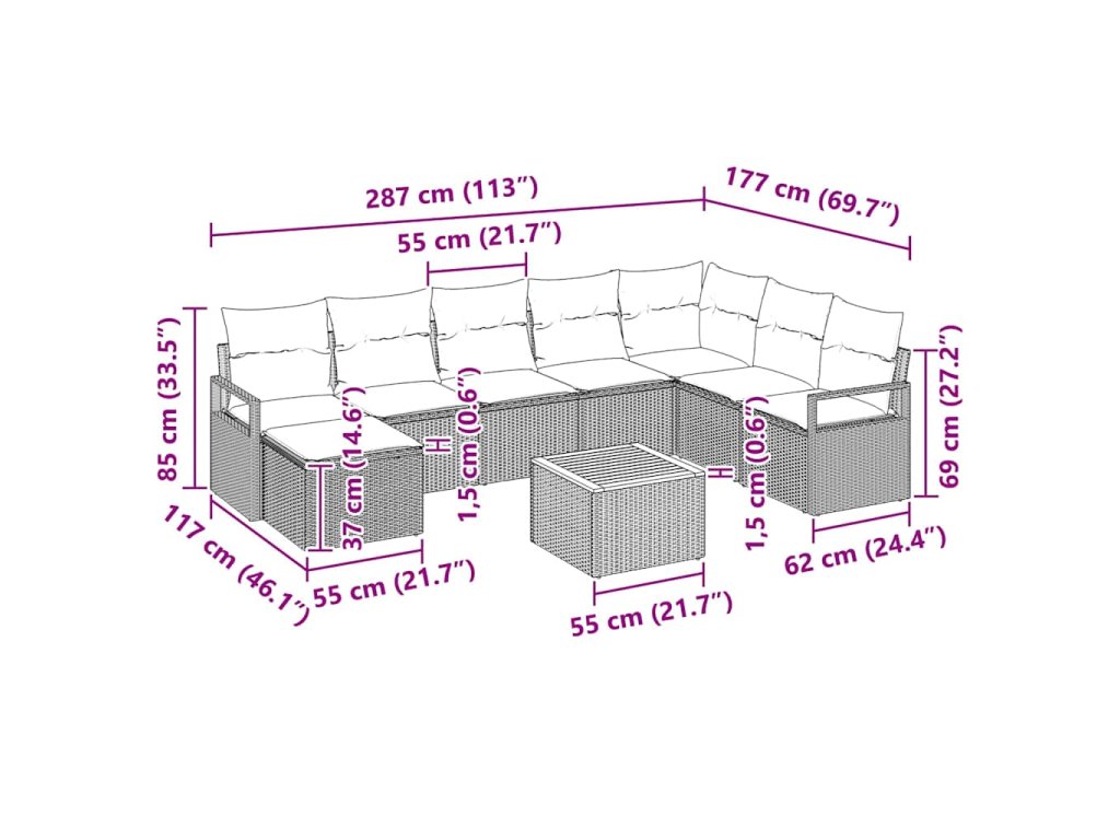 - Odolná konstrukce z polyratanu: Set pohovek je vyroben z polyratanu, který vypadá skvěle a také odolává počasí. Jeho trvanlivost zajišťuje, že nábytek zůstane v dobrém stavu po celý rok, aniž by podléhal slunci nebo vlhkosti.