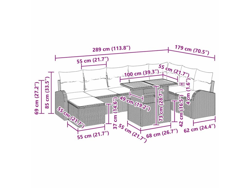 - Funkční úložný prostor: Každý kousek soupravy, jako křesla, rohová sedátka a podnožky, má vestavěný úložný prostor. Tento chytrý detail pomáhá udržovat tvůj prostor uklizený tím, že ti dává možnost schovat polštáře, když je nepotřebuješ. Je to super pro ukrytí zahradních her, knih nebo malých dek, takže všechno může být organizované a maximálně využité.