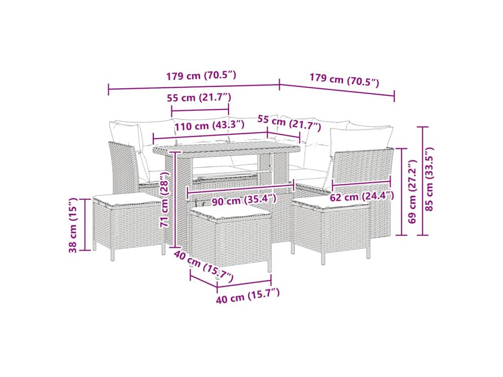 - Odolné materiály: Tento pohovkový set je vyroben z kvalitního poly ratanu a masivního akáciového dřeva, což zaručuje odolnost vůči venkovním podmínkám a skvělý vzhled. Materiály odolné UV záření a dennímu opotřebení, takže si tento kousek uchová svůj šarm po dlouhou dobu.