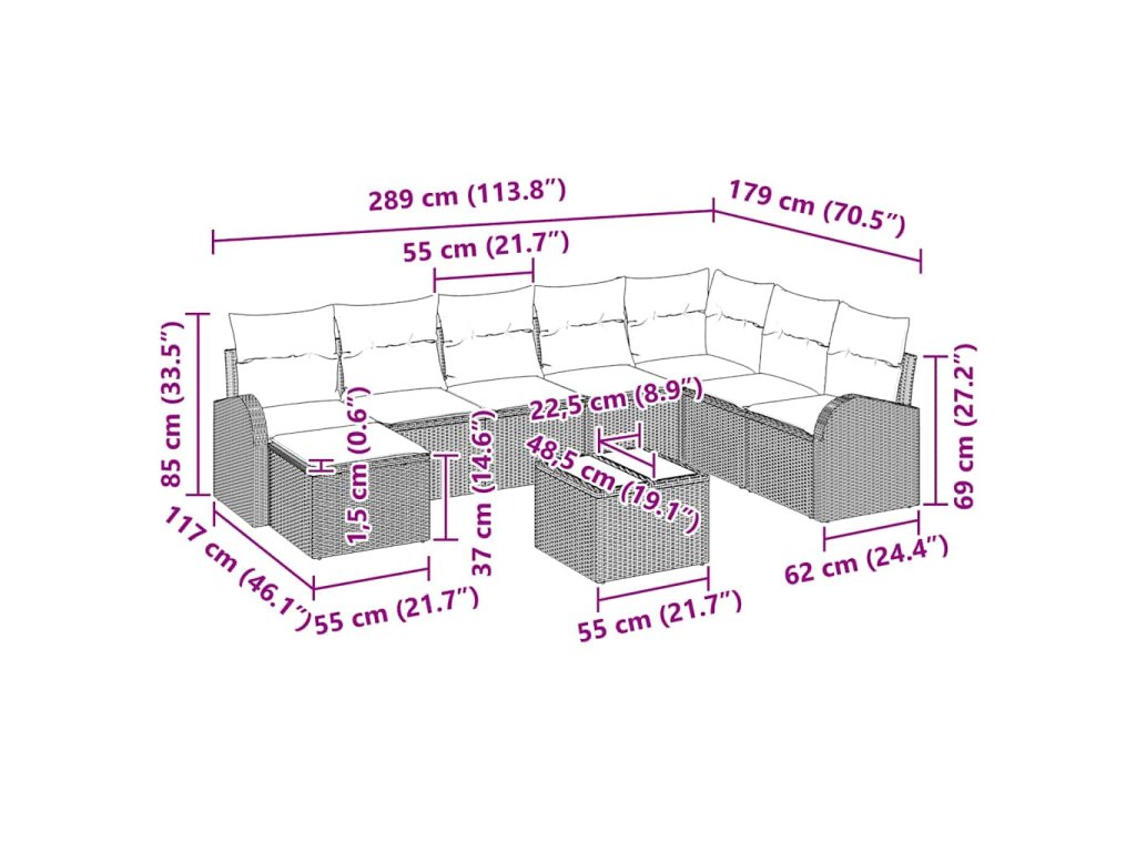 - Zahrnuté komponenty: Set zahrnuje rohové sedadlo, centrální sedadla, sofa s opěrkami, podnožku a polstry. Každý díl přispívá k pohodlnému sezení a různým preferencím.
