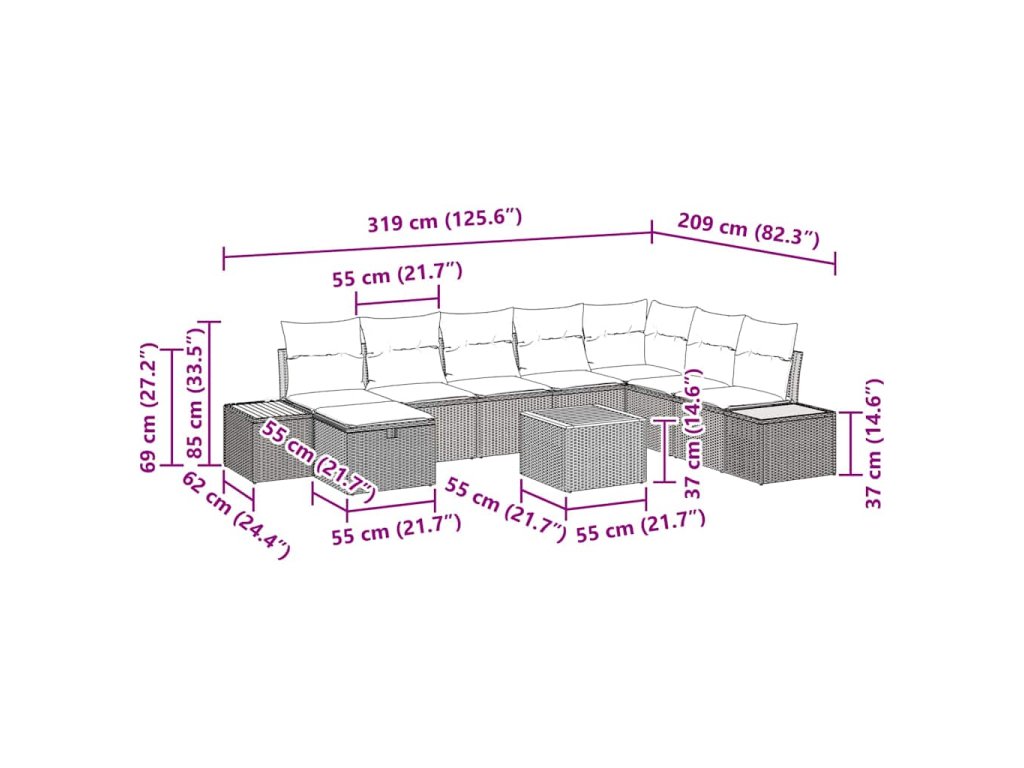 - Zahrnuté komponenty: Tento set obsahuje různé kusy, které nabízejí flexibilní možnosti sezení: čtyři střední sedáky, jeden roh, dvě boční pohovky, taburet a zahradní stůl. Každý kus si můžete přeskládat podle potřeby, takže se skvěle hodí do vašeho venkovního prostoru.