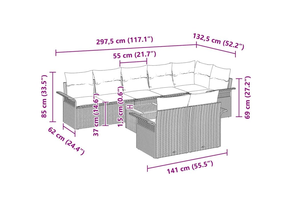 - Součásti: Set se skládá ze tří centrálních sedaček, jednoho rohového kusu, čtyř sofa s opěrkami a zahradního stolku. Každý kousek má dokončený zadní panel, takže skvěle vypadá z každé strany. Polstry jsou odnímatelné a mají zip pro snadnou údržbu.