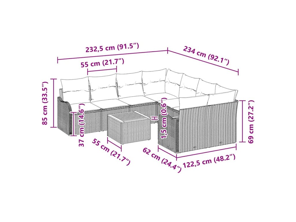 - Součásti: V sadě najdete 4 středové sedáky, 2 rohové sedačky, 2 pohovky a zahradní stůl. S tímhle máte dostatek místa pro rodinu a přátele. Každý kus, od zadního panelu z polyratanu po pohodlné sedáky, je navržen pro maximální komfort.
