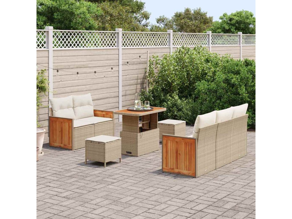 - Materiály: Tento set má kvalitní rám z odolné práškově lakované oceli, což zajišťuje dlouhou životnost. Sedáky a opěradla jsou vyrobeny z moderního poly ratanu, což zajišťuje pohodlí a eleganci. Povrch z masivního akáciového dřeva dodává zahradě přírodní šmrnc a celkově vylepšuje design.