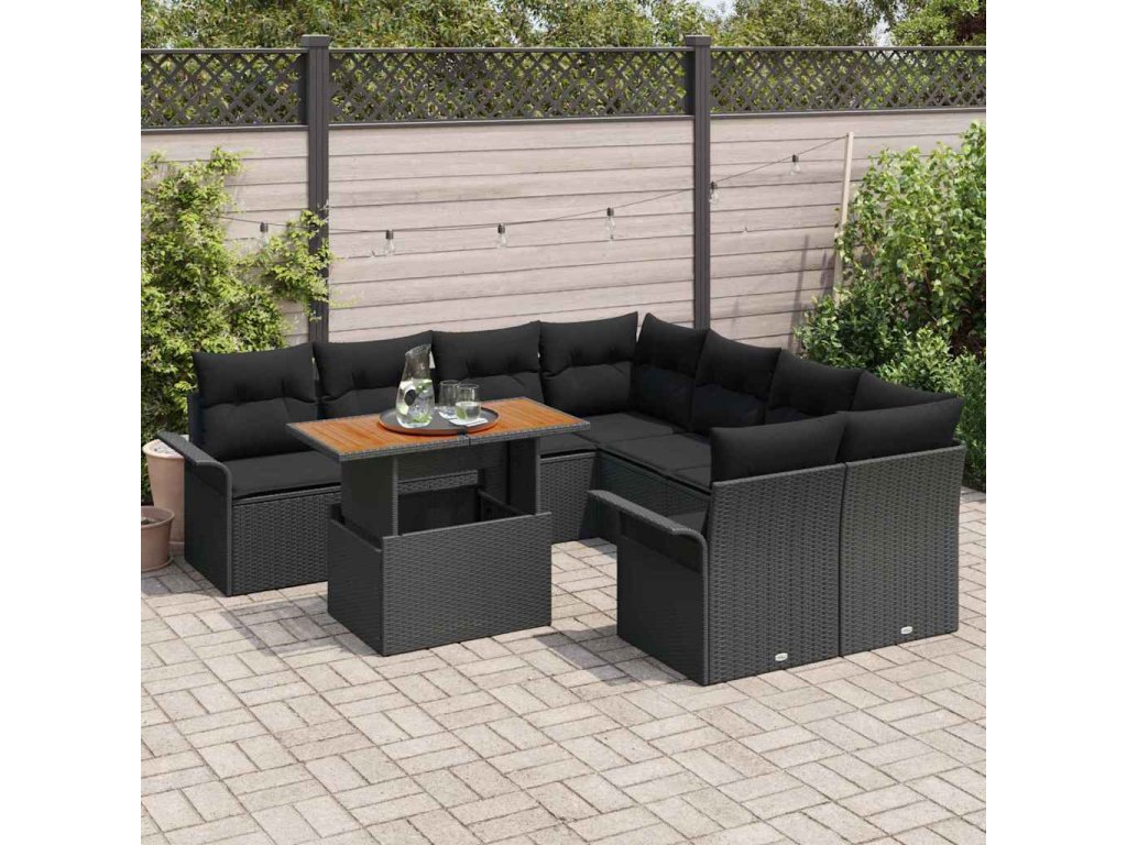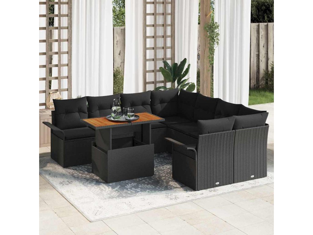 Tkaná textura: Užijte si eleganci a kouzlo tkaného polyratanu, který dodává charakter každému venkovnímu prostředí. Důmyslný tkaný vzor nejen zvyšuje vizuální přitažlivost, ale také přispívá k pohodlí a relaxaci nabízené touto zahradní sedací soupravou.,Odolné komponenty proti počasí: Navrženo pro dlouhověkost venku, tato sada je vyrobena z UV-odolného polyratanu a práškově lakované oceli, což zajišťuje, že odolává tvrdému slunečnímu záření a různým povětrnostním podmínkám a přináší klid na duši pro dlouhodobé používání.,Funkční design: S odnímatelnými a vyměnitelnými polštáři tato sada nabízí praktickou funkčnost. Společně s integrovanými možnostmi skladování v každém kusu zajišťuje, že budete udržovat uklizený a organizovaný venkovní prostor.,Aestetická univerzálnost: Její moderní design s zakřivenými opěrkami rukou a povrchem z hnědé akácie se pohodlně snoubí s různými styly. Ať už v zahradě nebo na terase, povyšuje prostředí prostřednictvím svých přizpůsobivých vzhledů.,Péče a údržba: Mějte klid, protože péče je jednoduchá. Otřete vlhkým hadříkem nebo použijte obal, když není používán, abyste zachovali jeho stav, zajišťující, že váš nábytek vždy vypadá jako nový. Pohodlné pokyny pro péči činí údržbu snadnou i pro zaneprázdněný životní styl.- Barva: Černá