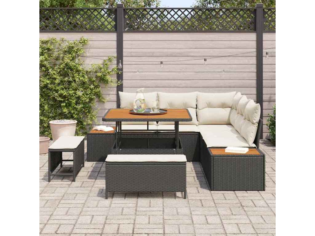 - Kvalitní materiály: Odolný poly ratan zajišťuje dlouhou životnost a UV ochranu, takže ji slunce nepoškodí. Masivní akáciové dřevo přidává přírodní krásu a pevnost a celkově vylepšuje pohodlí vašeho venkovního prostoru. Každý materiál je vybranej pro svou odolnost, takže souprava zůstane atraktivní a funkční po celou sezonu.