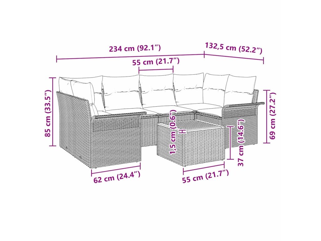 - Součásti: Souprava obsahuje prostorná středová a rohová sezení, ramení pohovky a zahradní stůl, všechny s polyratanovými rámy a pohodlnými opěradly. Pěnové polstrování zvyšuje komfort, takže klidně můžete sedět dlouho. Polyratanové područky jsou také zaměřené na uživatelský komfort a relaxaci.