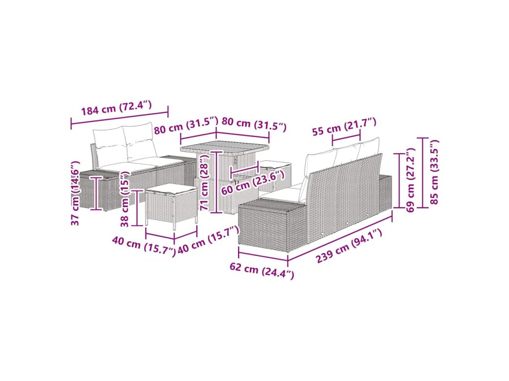 Tento moderní zahradní sofa set skvěle spojuje styl a funkčnost a zkrášlí jakýkoliv venkovní prostor. Je navržen tak, aby zapadl do moderních domácností a nabídl pohodlné sezení na terasách a v zahradách. Jeho minimalistický design s čistými liniemi je univerzální a hodí se k různému venkovnímu stylu. Sada je ideální na venkovní používání, ať už pro velké akce nebo pro únik do soukromí a relaxaci.