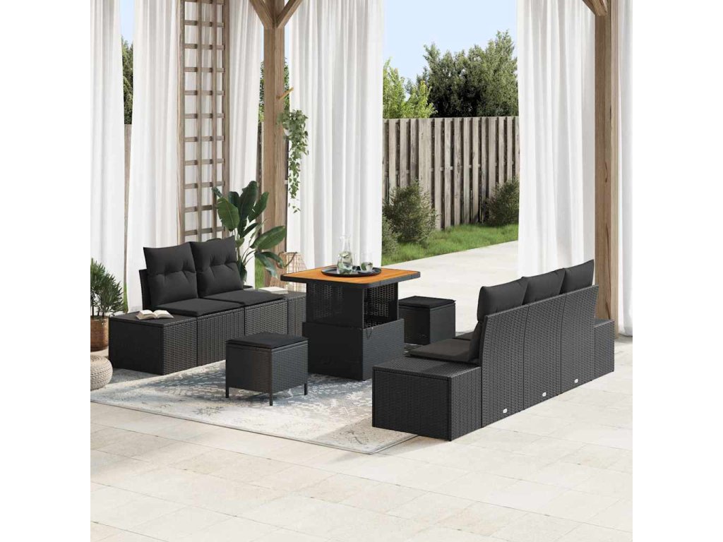 - Prémiové materiály: Tento sofa set vyrobený z poly ratanu je odolný a ideální pro venkovní prostředí. Akáciové dřevo mu dodává přírodní eleganci a ladí se s okolím. Poly ratan je lehký, ale pevný, takže ti vydrží dlouho v zahradě.