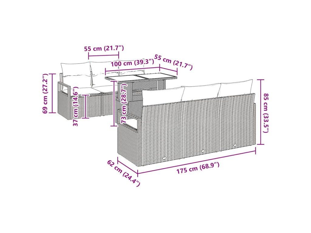 - 4 x armrestová sedačka: 60 x 62 x 69 cm (D x Š x V)