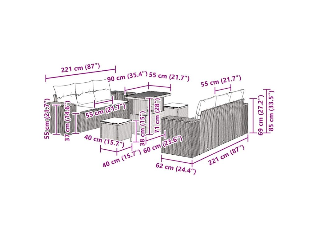 Tahle modulární zahradní sedací souprava je skvělý kus nábytku pro venkovní zahrady a terasy. Má moderní vzhled s čistými liniemi a málo ozdob, což dodává eleganci a zároveň to zaručuje praktičnost a pohodlí. Je to ideální kousek na zahradní párty nebo na lenošení venku. Můžete ji různě uspořádat podle toho, jak potřebujete, což znamená nekonečné možnosti přizpůsobení. Ať už se sluníte na jaře, nebo pořádáte letní brunch, tahle souprava se snadno přizpůsobí vašemu stylu života.