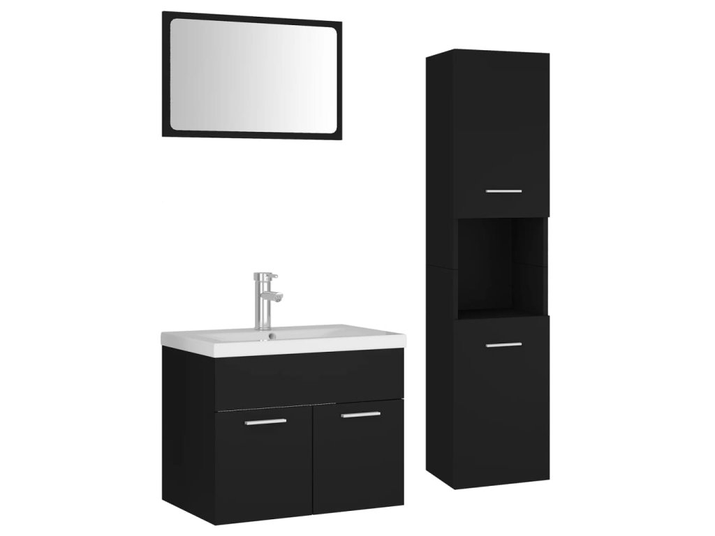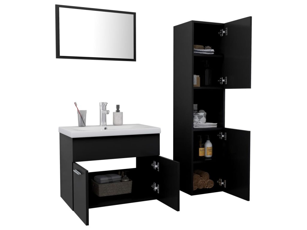 Set nábytku obsahuje skříňku pod umyvadlo, vysokou skříň, zápustné umyvadlo a zrcadlo. Stylová skříňka pod umyvadlo má 1 přihrádku a shora je ideálně uzpůsobená k umístění umyvadla. Ve vysoké skříni s dvojími dvířky najdete celkem 5 přihrádek, které vám poskytnou spoustu místa k uklizení vašich koupelnových potřeb. Keramické umyvadlo neslouží jen jako praktická nádoba pro každodenní použití – hraje také významnou dekorativní roli. Vzhledem k jeho trendovému a modernímu designu zaručeně zapadne do každého stylu zařízení. Součástí je i přepad, který umožňuje odtok vody, pokud se umyvadlo příliš přeplní. Zrcadlo vám rovněž pomůže zkrášlit vaše bydlení. Celou soupravu nábytku lze navíc snadno čistit navlhčeným hadříkem.