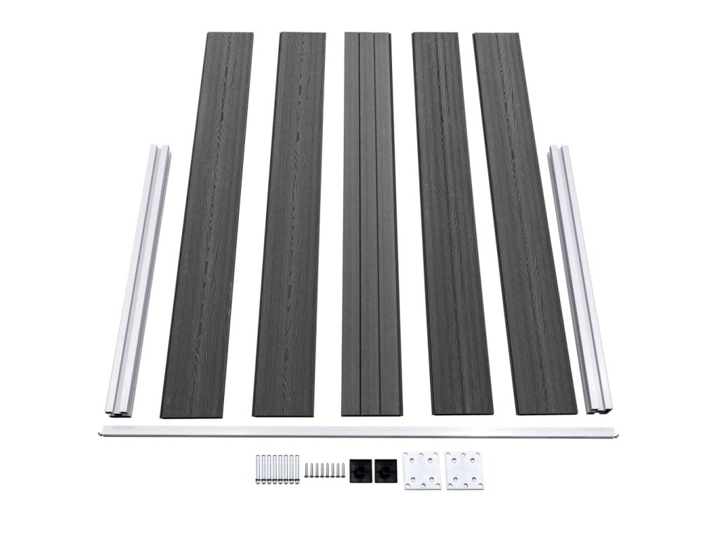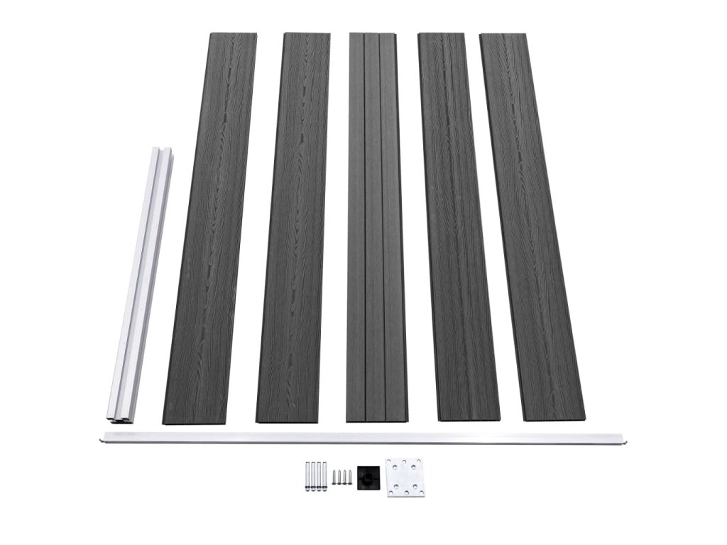 - Materiál: WPC (dřevoplast), hliník, ocel