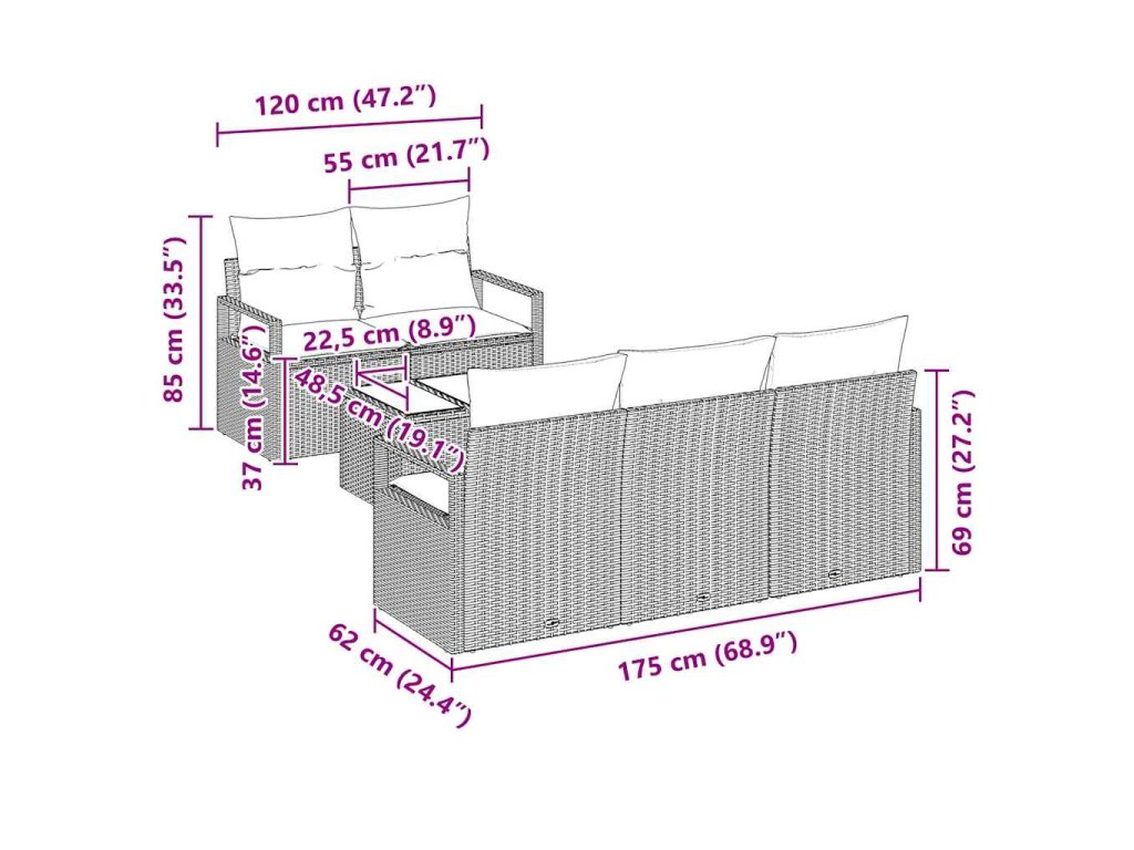 - Materiál poly ratan: Sada pohovek je vyrobená z odolného poly ratanu, který zvládá počasí i UV záření, takže se může používat dlouho bez vyblednutí. Pletená textura dodává eleganci a činí ji skvělým kouskem pro venkovní plochy.