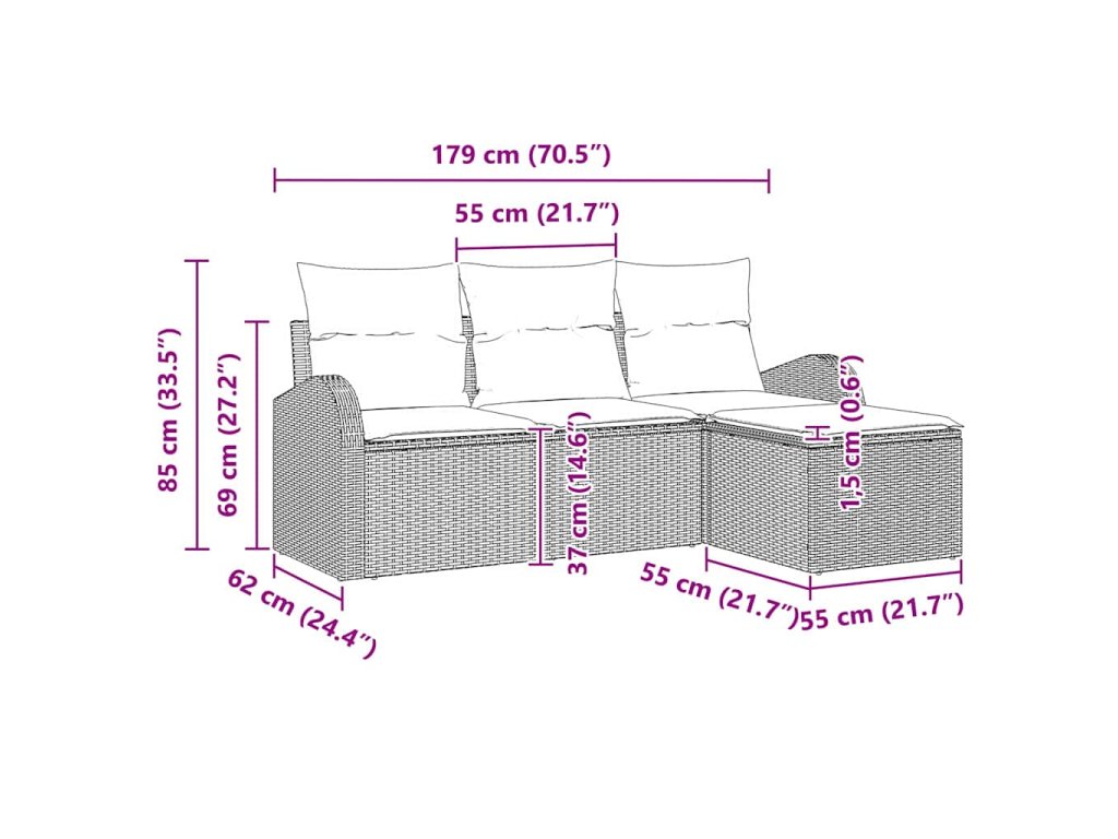 - 1 x střední sedadlo: 55 x 62 x 85 cm (ŠxHxV)