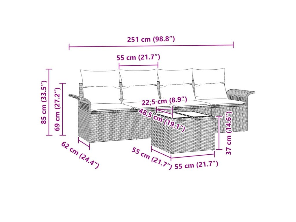 - Kvalitní materiály: Odolný poly ratan a práškově lakovaná ocel, které zaručují dlouhou životnost a odolnost vůči počasí. Polyesterové polštáře jsou pohodlné pro lenošení, skleněný stůl dodává šmrnc.