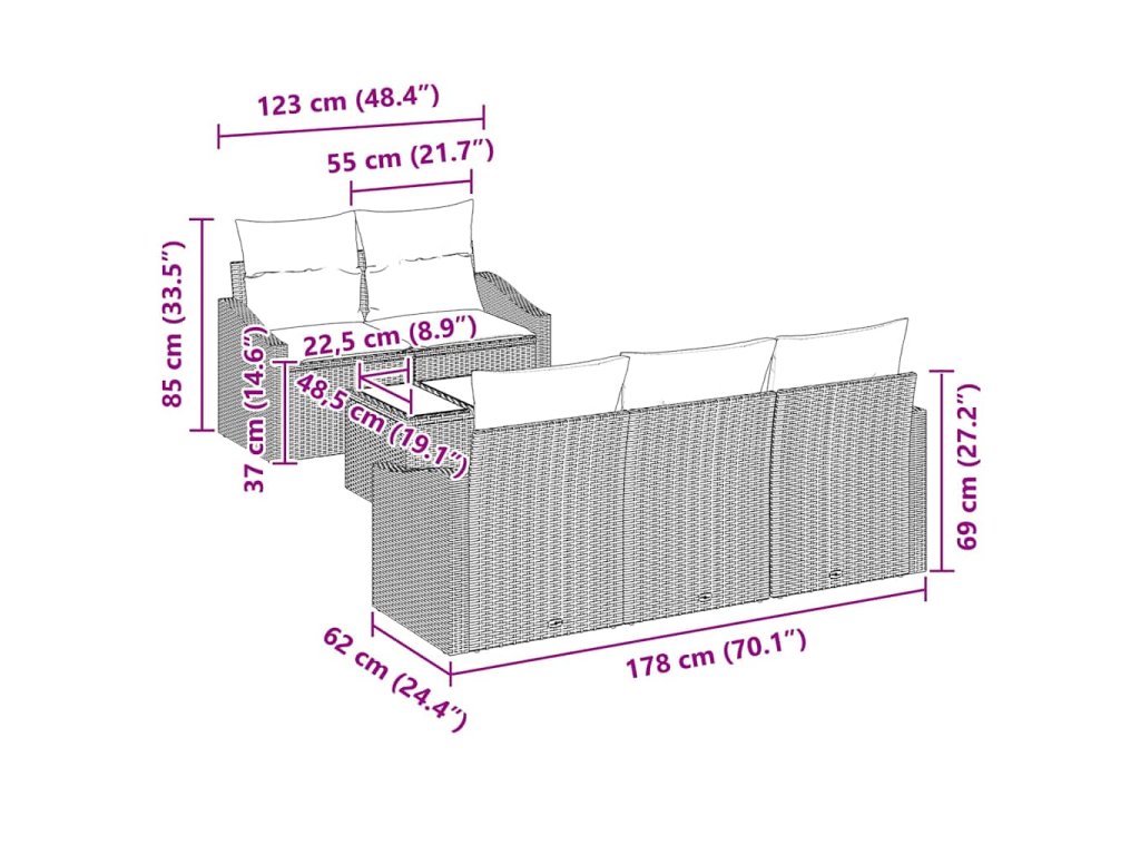 - 1 x Středové sedadlo: 55×62×85 cm (Š×H×V)