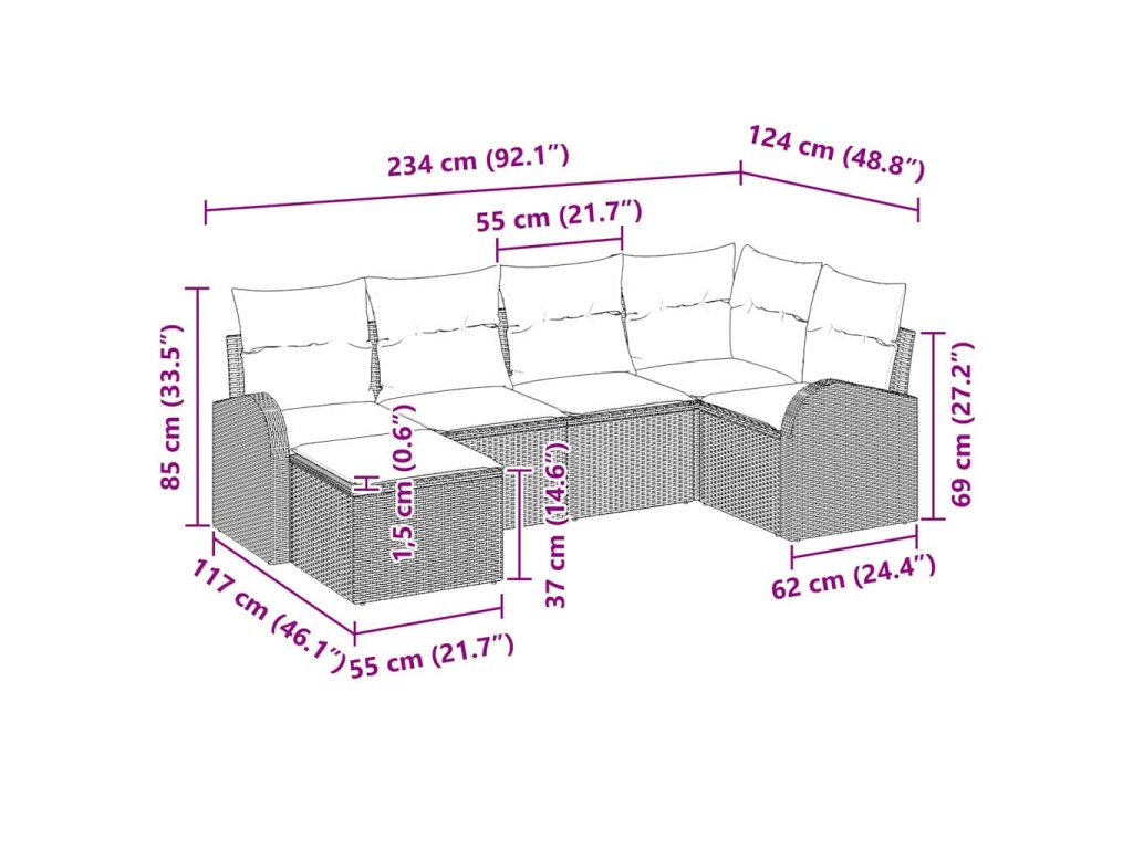 - Funkční komponenty: Každý díl obsahuje pohodlné sedací podušky s odnímatelným potahem, což usnadňuje údržbu. Opěrky zad a rukou z polyratanu přidávají na ergonomice a pohodlí a zároveň harmonizují s celkovým designem.