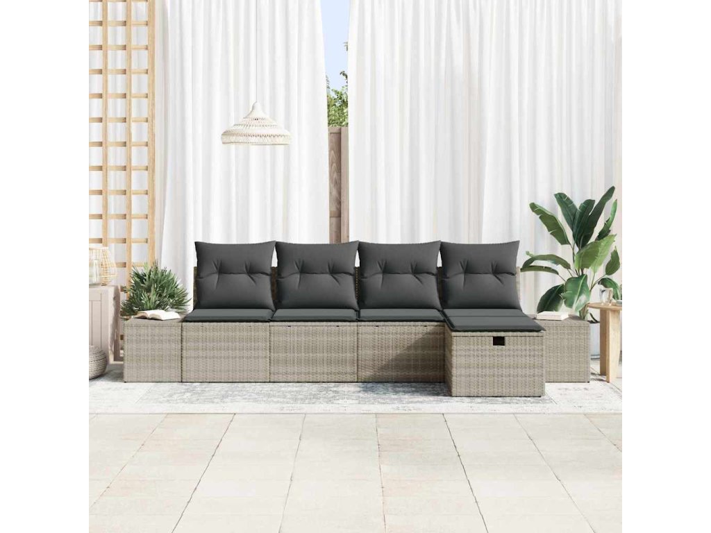 - Materiál z polyratanu: Set je vyroben z odolného poly ratanu, který vypadá skvěle a vydrží dlouho. Tohle bylo vybrané kvůli odolnosti vůči UV záření a vlhkosti, takže si zachová vzhled a funkčnost bez velké péče.