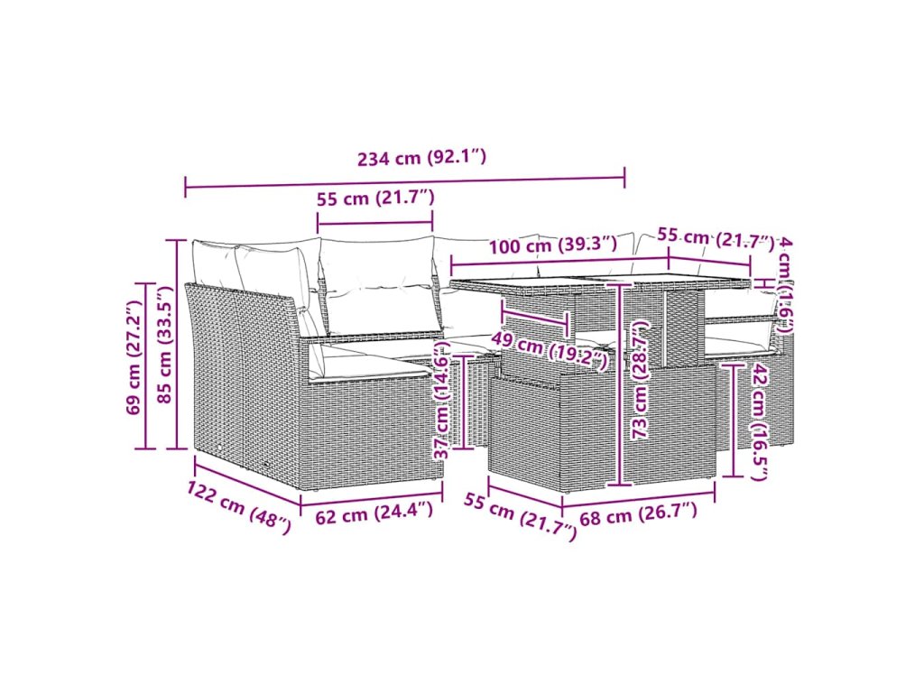 - 1 x rohové sedadlo: 62×62×85 cm (Š×H×V)