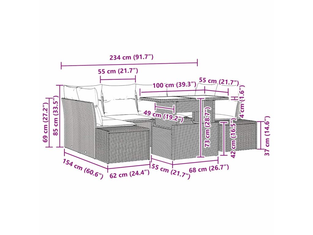 - 2 x Rohové sedadlo: 62 x 55 x 85 cm (D x Š x V)