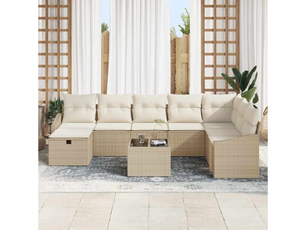 - Materiály z polyratanu: Tento pohovkový set je odolný a hezký, ideální na venek. Materiály zvládnou vítr i déšť, takže vydrží roční období a skoro nic nepotřebují na údržbu, aby vypadaly dobře.
