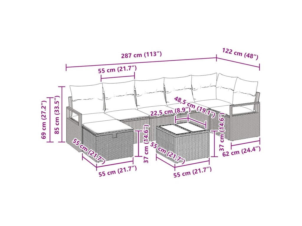 - 1 x rohové sedadlo: 62 x 62 x 85 cm (D x Š x V)